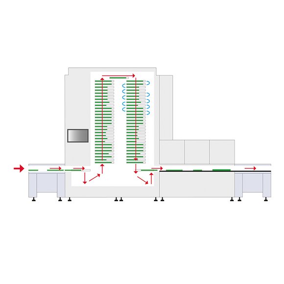 Im Durchlauftrockner Pramo werden die Baugruppen auf Warenträgern mit sogenannten „Schiffchen“-Aufnahmen in Schlaufen durch das System transportiert. Innerhalb des Trockners durchlaufen sie mehrere Zonen, in denen sie auf die entsprechende Temperatur aufgeheizt und anschließend für den Trocknungs-/Aushärteprozess auf der voreingestellten Temperatur gehalten werden. Die Temperatur im Trockner beträgt maximal 150 Grad Celsius. Um die Materialien entsprechend der Vorgaben auszuhärten, kann die Taktzeit nach der notwendigen Verweildauer der Baugruppen im Trocknungssystem ausgerichtet werden. Die flexiblen Warenträgeraufnahmen sind austauschbar, wodurch unterschiedlichste Baugruppen und auch Sonderformen jederzeit sicher und zuverlässig durch die Anlage geführt werden.