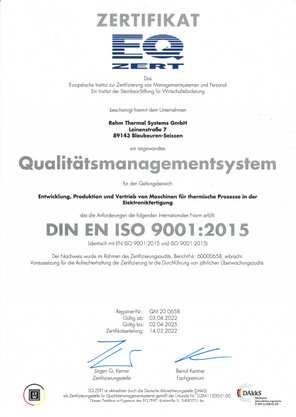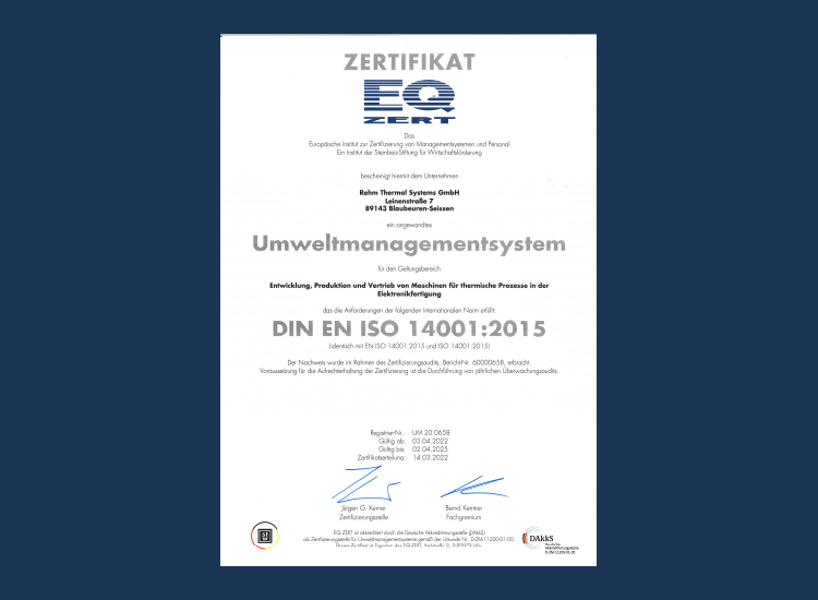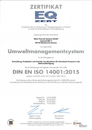 Rehm Thermal Systems wird seit 2004 regelmäßig nach DIN EN ISO 9001 zertifiziert. Alle Maschinen planen und konstruieren wir außerdem CE-konform nach Maschinenrichtlinien. Regelmäßig werden wir im Energieaudit nach DIN EN 16247-1 zertifiziert und haben auch mit der Einführung des Umweltmanagementsystems nach DIN EN ISO 14001:2015 bei der Rehm Thermal Systems GmbH einen weiteren Meilenstein in Richtung Klimaneutralität gesetzt.