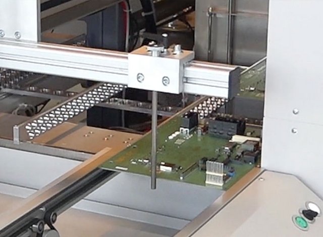 Die Condenso smartline arbeitet mit einem Pusher zur Beladung der im System bereits integrierten Warenträger. Hierbei werden die Baugruppen von einem Zuführband auf den Warenträger geschoben. Der Warenträger kann mit jeweils einer Mittenunterstützung pro Spur ausgestattet werden. Pro Warenträger sind max. 6 Spuren möglich. Die max. Baugruppengröße ist 650 x 650 mm. Die Entladung der Warenträger erfolgt ebenfalls mit einem Pusher auf das nachfolgende Transportband.