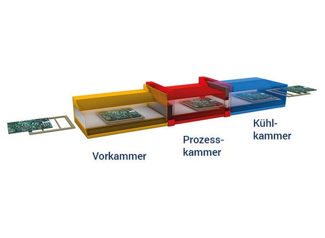 Die CondensoX-Line ist als 3-Kammer-System aufgebaut, um niedrige Taktzeiten bei Inline-Lötprozessen zu erreichen. Alle 3 Kammern können durchgängig mit Stickstoff geflutet werden. Auf diese Weise lassen sich voidreduzierte Lötstellen in einer komplett inerten Prozessumgebung herstellen, unabhängig davon, ob es sich um Standardbaugruppen mit BGA-Bauelementen oder um DCB-Substrate für die Leistungselektronik handelt.