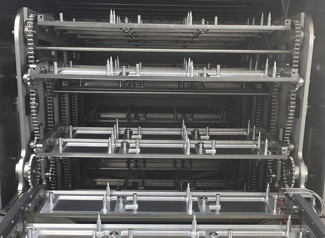 Die Securo arbeitet mit einem Warenträgerumlauf nach dem Mäander-Prinzip: Die Warenträger sind mit den zu testenden Baugruppen bestückt und bewegen sich in dicht aufeinanderfolgenden, bogenförmig geschwungenen Schleifen durch die Prozesskammer. Der zur Verfügung stehenden Platz wird so ideal ausgenutzt, was für größtmöglichen Durchsatz sorgt. Standardmäßig hat die Securo 30 dieser Warenträger und fünf Be- bzw. Entladeklappen, somit können insgesamt 150 Bauteile aufgenommen werden. Soll auf andere Baugruppenformen und Geometrien umgerüstet werden, bietet die Securo mit dem wechselbaren Carriersystem die optimale Lösung.
