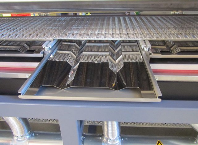 Die Prozesskammer des RDS Trockners besteht aus einem stabilen Edelstahlgehäuse und ist für Prozesstemperaturen bis 400 °C ausgelegt. Das Heizsystem ist in mehrere Zonen eingeteilt, die mittels IR-Strahler pro Zone geregelt und auf das erforderliche Temperaturprofil eingestellt werden kann. Durch das integrierte Konvektionsgebläse mit Zuheizung wird eine homogene Temperaturverteilung im Prozessraum erreicht und eine Temperatursenkung vermieden.