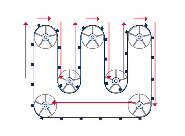 Der Transport der Baugruppe durch die Anlage erfolgt auf einem Warenträgerumlauftransport. Die Taktzeit ist dabei einstellbar. Um möglichst lange Durchlaufzeiten und eine hohe Stückzahl realisieren zu können, ist der Transport in Schlaufen ausgeführt. Dies reduziert die Grundfläche sowie die Höhe des Systems. Je nach Warenträgeranzahl ist der Pramo als 2-, 3- oder 4-Schlaufentransport erhältlich.