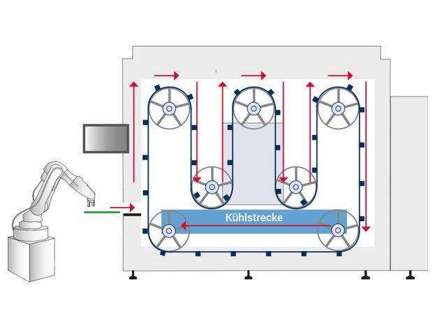 Über einen Wärmetauscher wird die Abwärme vom internen an den externen Wasserkreislauf übergeben und so energieschonend aus dem Fertigungsraum abtransportiert. Alternativ ist anstelle des Wärmetauschers ein Residue-Management-System mit zwei Kühler-/Filtereinheiten zur Kaltkondensation erhältlich. Die Filter können in einem Ultraschallbad zu Wartungszwecken leicht gereinigt werden. Die Rückführstrecke kann alternativ auch als zusätzliche Heizzone ausgeführt werden, wenn die Teile warm entladen werden sollen.