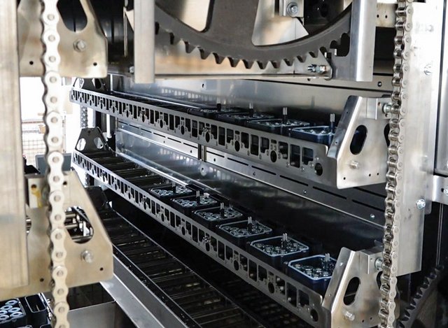Die Gondeln/Warenträgerschiffchen verfügen über eine Spanneinheit zum Fixieren für die automatische Beladung mit einem Roboter. Eine Meßgondel mit präparierten Teilen und einem Speichermessgerät ist über eine Schnellspannfixierung einfach einsetzbar.
