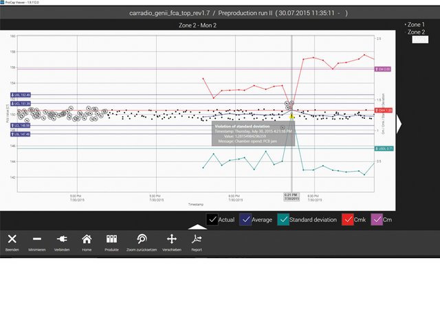 ProCap bietet eine kontinuierliche, statistische Prozess-Stabilitätskontrolle und wurde speziell für die Anwendung auf den Anlagen der Vision-Serie von Rehm zugeschnitten. Mit einer sensiblen Sensorik wird die Temperatur, bzw. der Wärmeeintrag über die komplette Baugruppe permanent während des gesamten Lötvorgangs gemessen und die Prozessparameter automatisch für das Produkt beim ersten Anlauf abgelegt. Jede weitere Baugruppe wird mit den zu diesem Produkt abgespeicherten Parametern verglichen. Dazu werden die ersten 50 Baugruppen des Produkts als sogenannte statistische Prozesskontrolle gemessen und verglichen. In dieser „Baseline“ werden statistische Kenngrößen, wie die natürliche Varianz des Prozesses, ermittelt. Daraus ergibt sich ein Mittelwert als Referenz für alle weiteren Messungen. Dieser lässt Rückschlüsse auf die Stabilität des Produktionsprozesses, der Maschinenfähigkeit und auf die Wiederholgenauigkeit des Lötprofils zu.