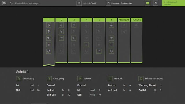Optimale Prozesssteuerung und einfache Profilierung bietet die ViCON Software für die Condenso-Serie. Durch klar strukturierte Prozessschritte können - für jeden Step separat - unterschiedliche Parameter eingestellt werden, wie Einspritzung, Absaugung, benötigte Haltezeit, Zeitüberschreitung oder das Löten mit oder ohne Vakuum. Dadurch erreichen Sie höchstmögliche Flexibilität bei der Profilierung sowie eine hohe Prozessstabilität.